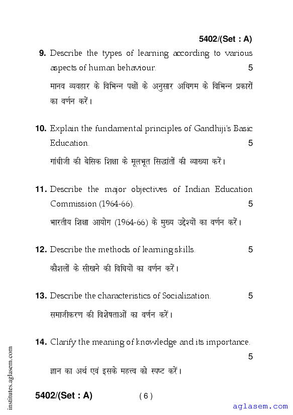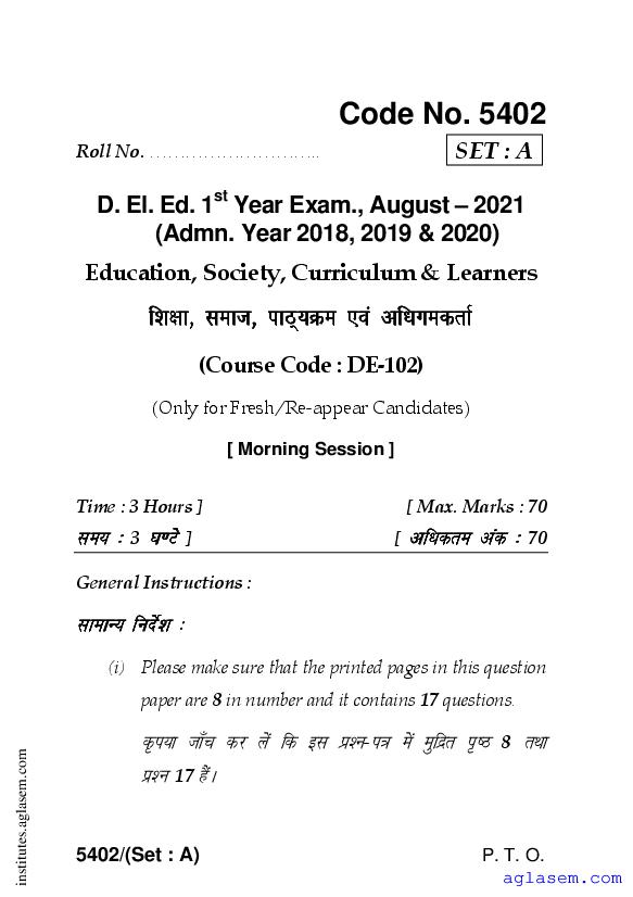 Haryana D.El.Ed 1st Year Question Paper Education, Society, Curriculum & Learners has been published after exam. Therefore you can now download the D.El.Ed 1st Year Question Paper PDF of Education, Society, Curriculum & Learners from here on aglasem. This Haryana D.El.Ed Question Paper is for the subject Education, Society, Curriculum & Learners which is taught in 1st Year of the DElEd curriculum in Haryana. Therefore it contains actual questions asked in previous years exams of the subject Education, Society, Curriculum & Learners held in Haryana DIETs, teaching institutes. So by solving this D.El.Ed previous year question paper, you can improve your 1st Year exam prep and aim to score full marks in Education, Society, Curriculum & Learners.
