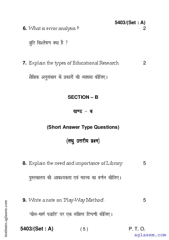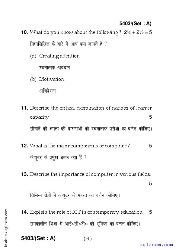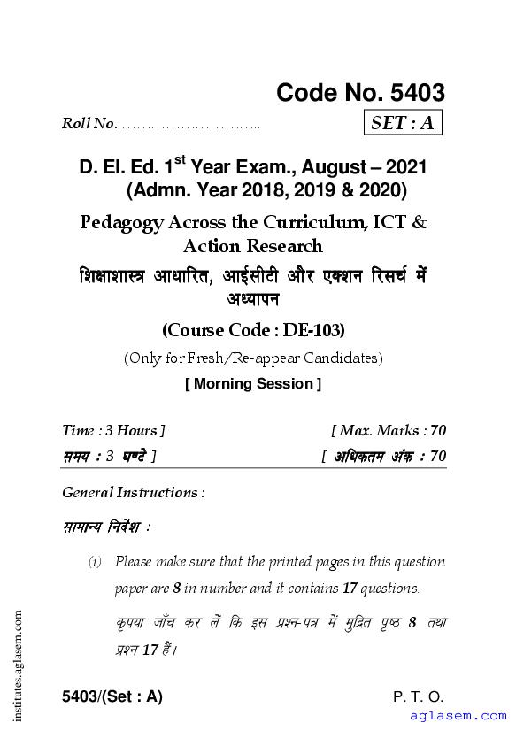 Haryana D.El.Ed 1st Year Question Paper Pedagogy Across the Curriculum, ICT & Action Research has been published after exam. Therefore you can now download the D.El.Ed 1st Year Question Paper PDF of Pedagogy Across the Curriculum, ICT & Action Research from here on aglasem. This Haryana D.El.Ed Question Paper is for the subject Pedagogy Across the Curriculum, ICT & Action Research which is taught in 1st Year of the DElEd curriculum in Haryana. Therefore it contains actual questions asked in previous years exams of the subject Pedagogy Across the Curriculum, ICT & Action Research held in Haryana DIETs, teaching institutes. So by solving this D.El.Ed previous year question paper, you can improve your 1st Year exam prep and aim to score full marks in Pedagogy Across the Curriculum, ICT & Action Research.