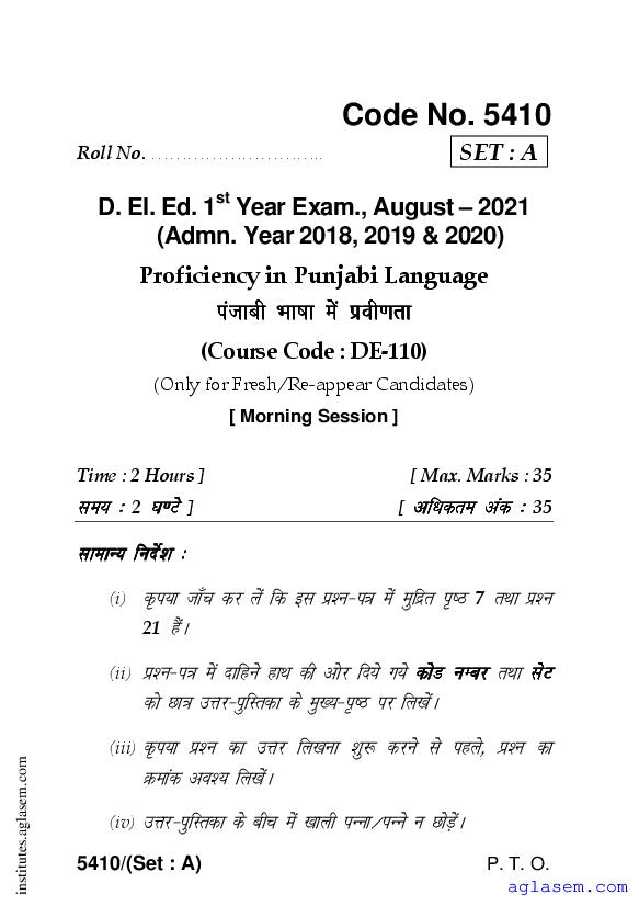 Haryana D.El.Ed 1st Year Question Paper 2021 Proficiency in Punjabi Language View Download