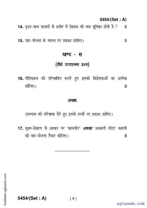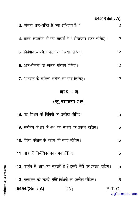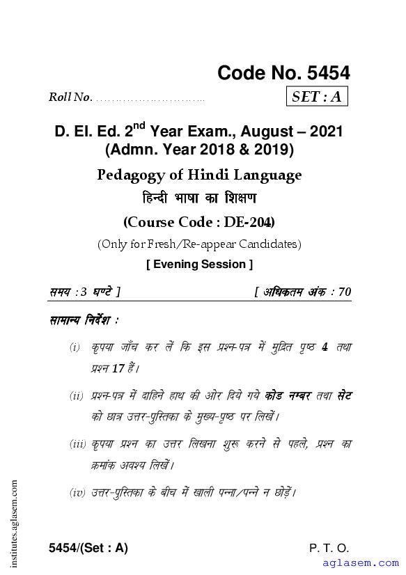 Haryana D.El.Ed 2nd Year Question Paper Pedagogy of Hindi Language has been published after exam. Therefore you can now download the D.El.Ed 2nd Year Question Paper PDF of Pedagogy of Hindi Language from here on aglasem. This Haryana D.El.Ed Question Paper is for the subject Pedagogy of Hindi Language which is taught in 2nd Year of the DElEd curriculum in Haryana. Therefore it contains actual questions asked in previous years exams of the subject Pedagogy of Hindi Language held in Haryana DIETs, teaching institutes. So by solving this D.El.Ed previous year question paper, you can improve your 2nd Year exam prep and aim to score full marks in Pedagogy of Hindi Language.