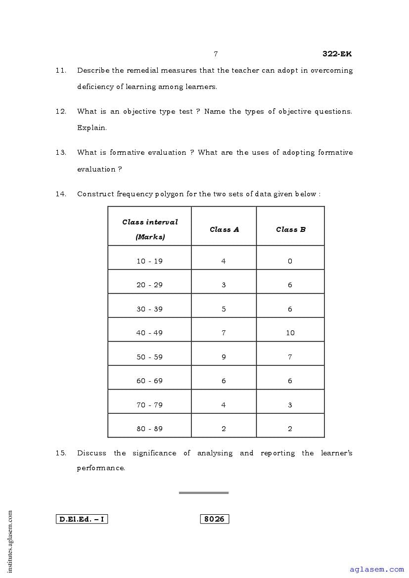 Karnataka D.El.Ed 1st Year Question Paper Educational Assessment & Evaluation has been published after exam. Therefore you can now download the D.El.Ed 1st Year Question Paper PDF of Educational Assessment & Evaluation from here on aglasem. This Karnataka D.El.Ed Question Paper is for the subject Educational Assessment & Evaluation which is taught in 1st Year of the DElEd curriculum in Karnataka. Therefore it contains actual questions asked in previous years exams of the subject Educational Assessment & Evaluation held in Karnataka DIETs, teaching institutes. So by solving this D.El.Ed previous year question paper, you can improve your 1st Year exam prep and aim to score full marks in Educational Assessment & Evaluation.