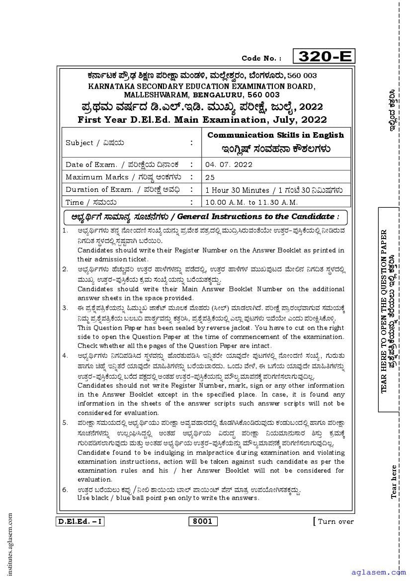 Karnataka D.El.Ed 1st year Question Paper 2022 English View Download