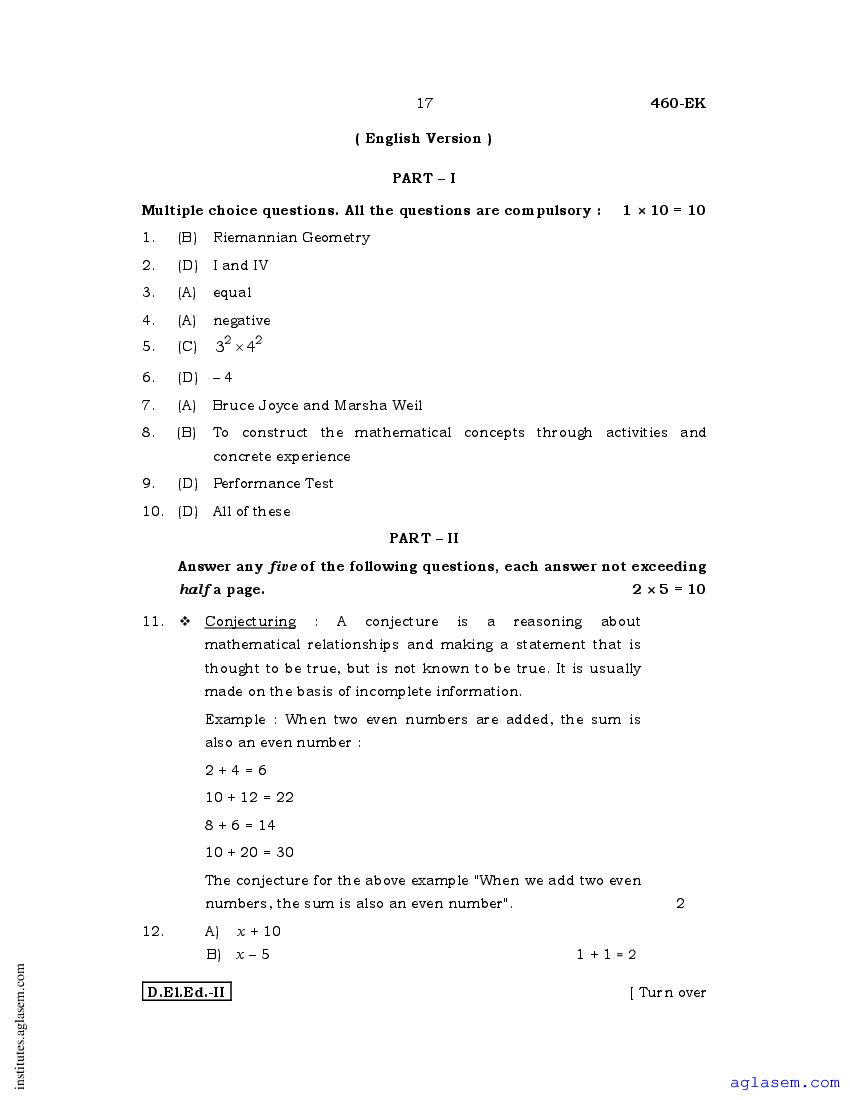 Karnataka D.El.Ed 2nd Year Question Paper Maths has been published after exam. Therefore you can now download the D.El.Ed 2nd Year Question Paper PDF of Maths from here on aglasem. This Karnataka D.El.Ed Question Paper is for the subject Maths which is taught in 2nd Year of the DElEd curriculum in Karnataka. Therefore it contains actual questions asked in previous years exams of the subject Maths held in Karnataka DIETs, teaching institutes. So by solving this D.El.Ed previous year question paper, you can improve your 2nd Year exam prep and aim to score full marks in Maths.