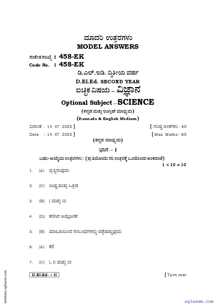 Karnataka D.El.Ed 2nd year Question Paper 2022 Science View Download